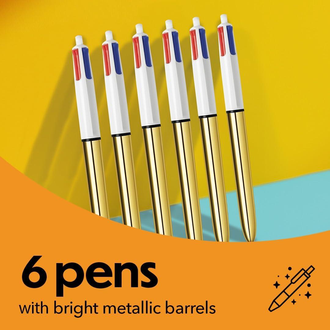 WHAT'S INCLUDED: Pack of six (6) BIC 4-Color Shine Retractable Ballpoint Pens with assorted ink colors in metallic gold barrels