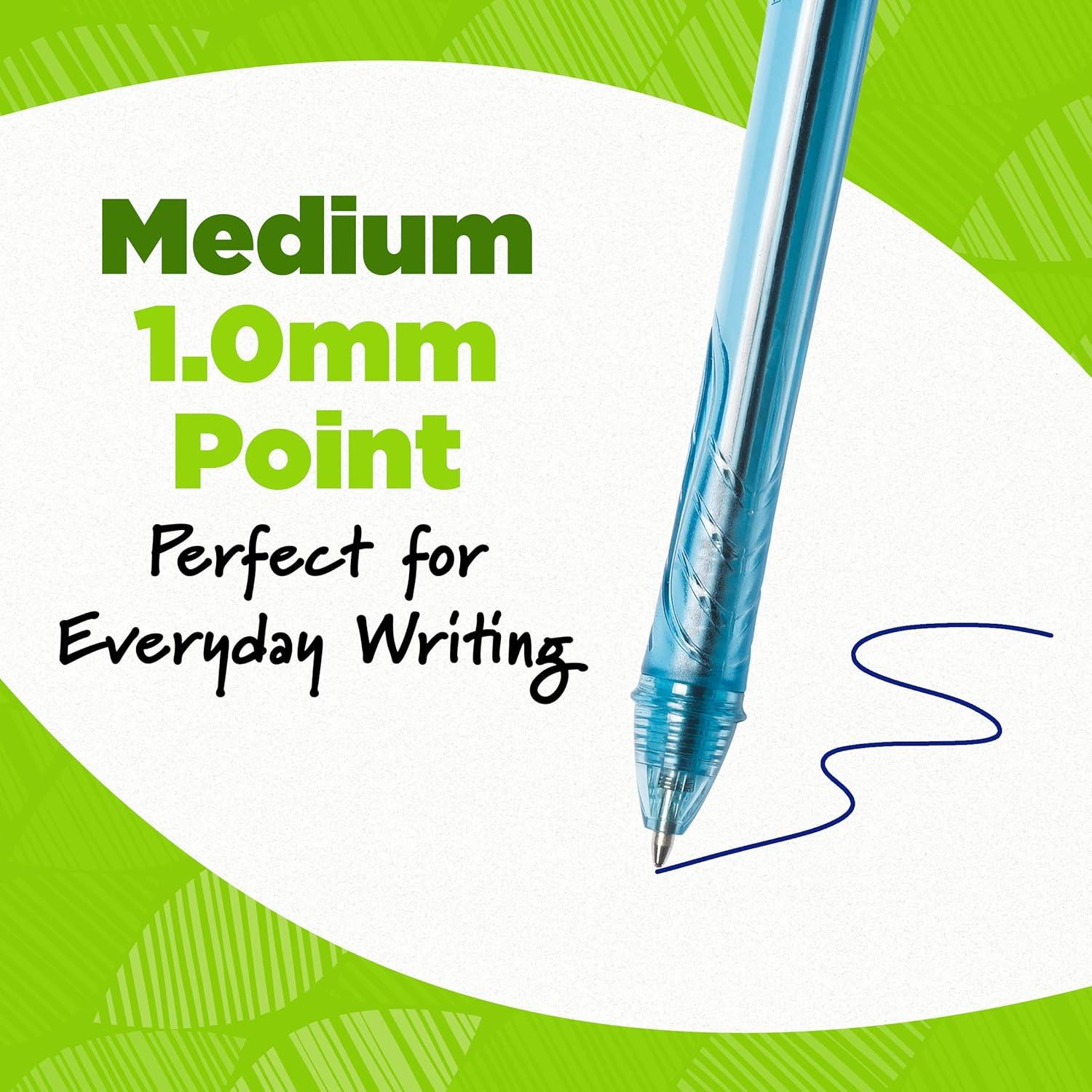 Help write our planet’s future with the long-lasting BIC Ecolutions Ocean-Bound Ball Pens. This ballpoint pen is not only made from 78% ocean-bound recycled plastic *excluding ink cartridge and the paperboard packaging is made up of 100% recycled content and is recyclable. **Ocean-bound plastic is material collected within 50km of a shore or waterway that leads to the ocean, preventing it from entering the ocean. With a medium 1.0 mm point, it’s the perfect BIC pen for everyday writing. The smooth writing ink system delivers hours of effortless writing in black ink. A classic, slender, semi-clear barrel acts as a handy window when checking pen ink levels. These black ink pens are a smart choice for righties and lefties, as the black ink dries quickly to prevent smearing. Use the convenient clip to hook the ink pen onto your pocket or notebook. Available in two classic colors, these sturdy, high-performance ball pens come in black or blue pen ink color. Looking for larger quantities of eco-friendly office or school supplies? Choose this pen bulk, which contains 12 blue pens. Pick up BIC Ecolutions Ocean Bound Ball Pen for a high-quality, affordable writing utensil you can trust.