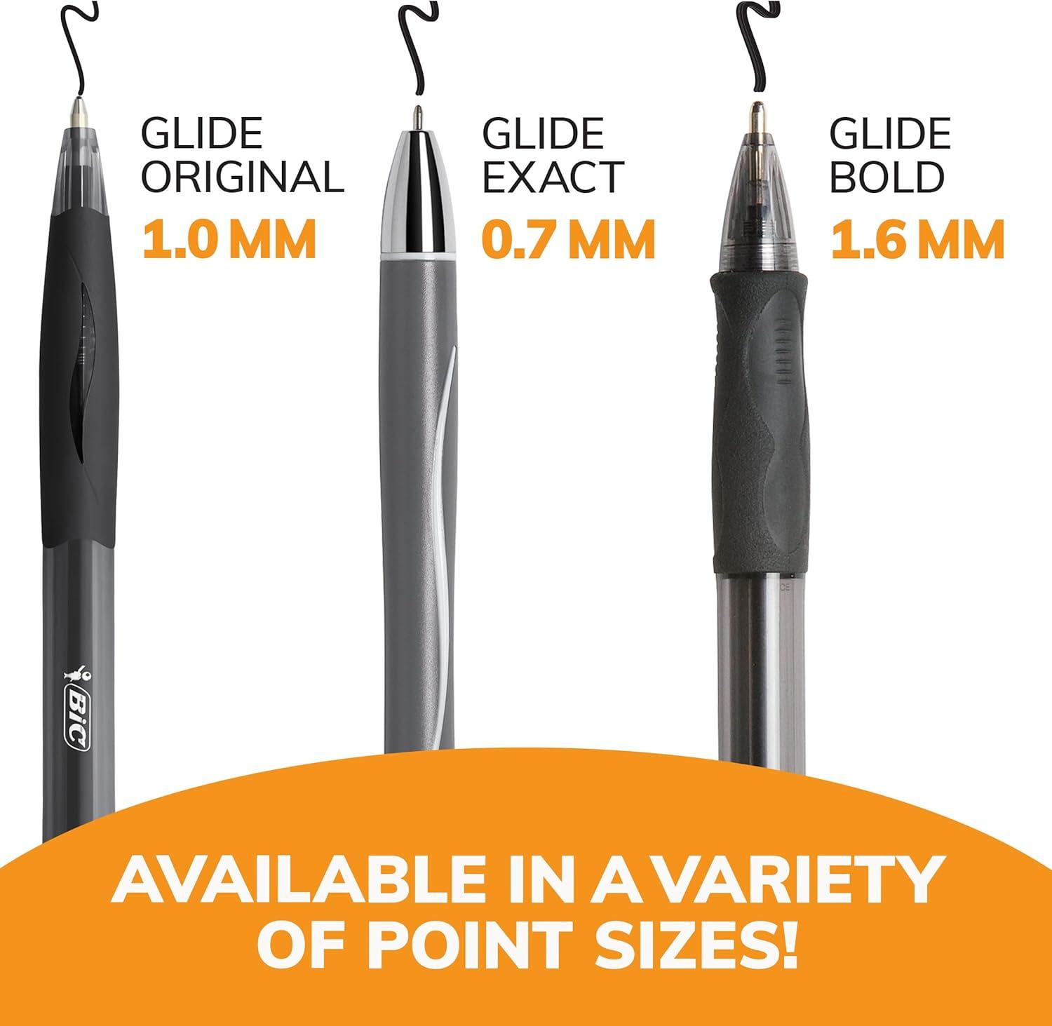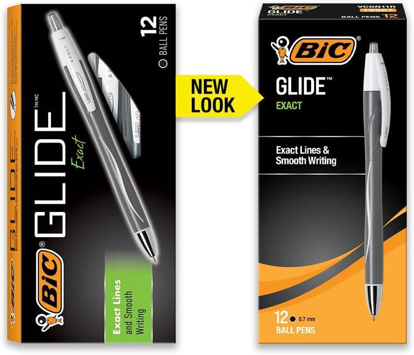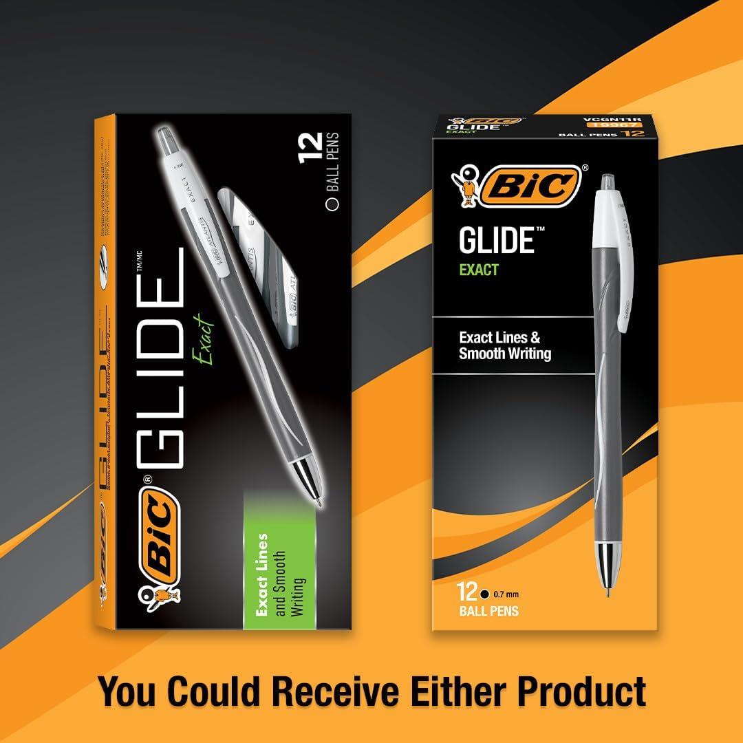 Experience ultra smooth writing with BIC Glide Exact Black Retractable Ballpoint Pens. These 0.7mm fine point ballpoint pens create precise lines, making them great for everyday writing at work, school or home. With ultra smooth writing, they’re the ideal ball point pens for writing lists, taking notes, journaling and more. BIC Glide Exact Black Retractable Ballpoint Pens are a smart choice for school supplies. Write easily with these retractable pens, which have a comfortable rubber grip. Plus, the clip easily attaches to pockets, notebooks and more for quick access on the go. Designed for convenience, these black pens let you start writing with just one click. Every pen in this BIC pens bulk pack has a rubber grip for your comfort. With this 12-count pack of fine point pens, you can stock up on dependable BIC ballpoint pens. Looking for reliable pens for school or office supplies? Choose BIC Glide Exact Black Retractable Ballpoint Pens for a high-quality, affordable product you can trust.
