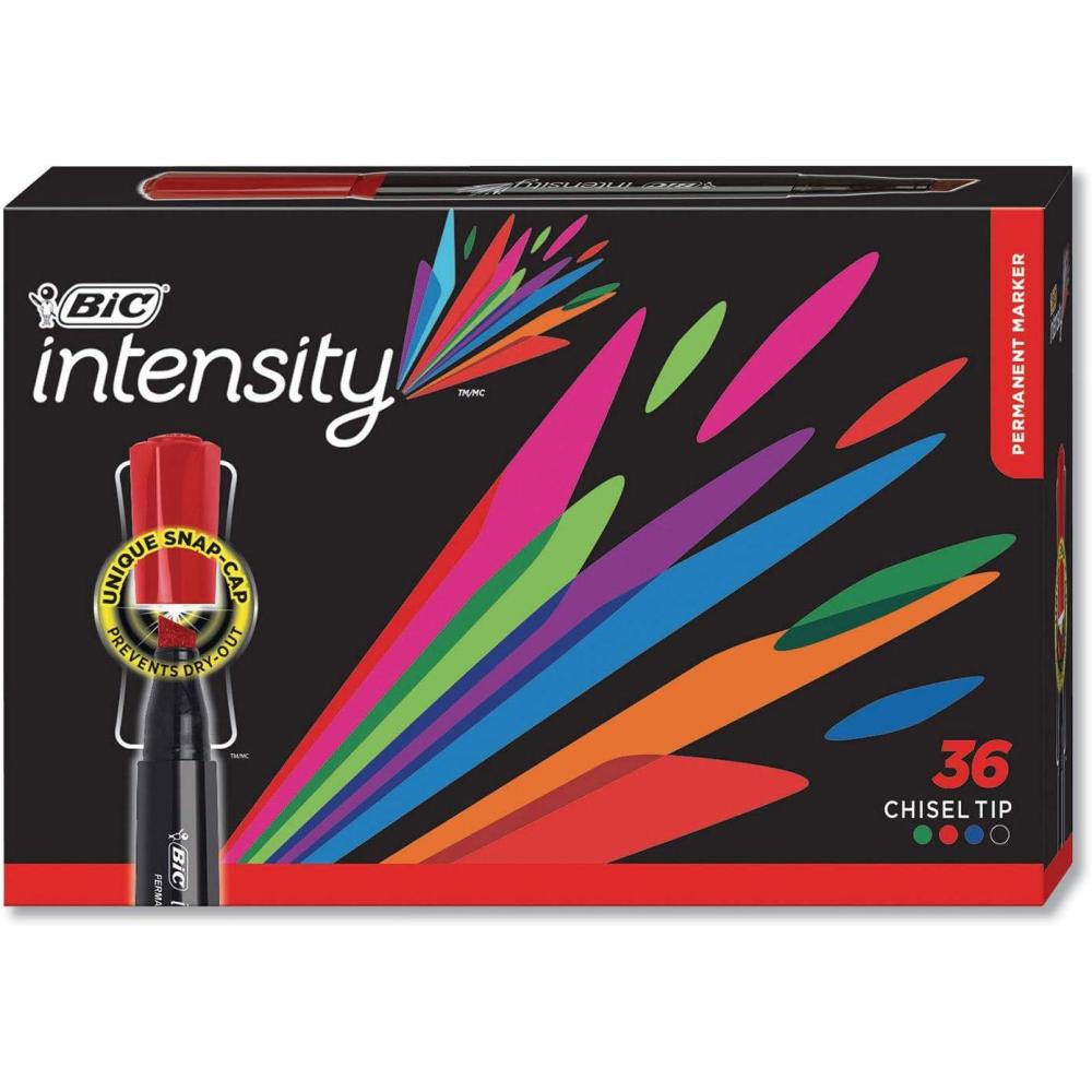 One 36-count box of BIC Intensity Permanent Markers in black, blue, red and green.