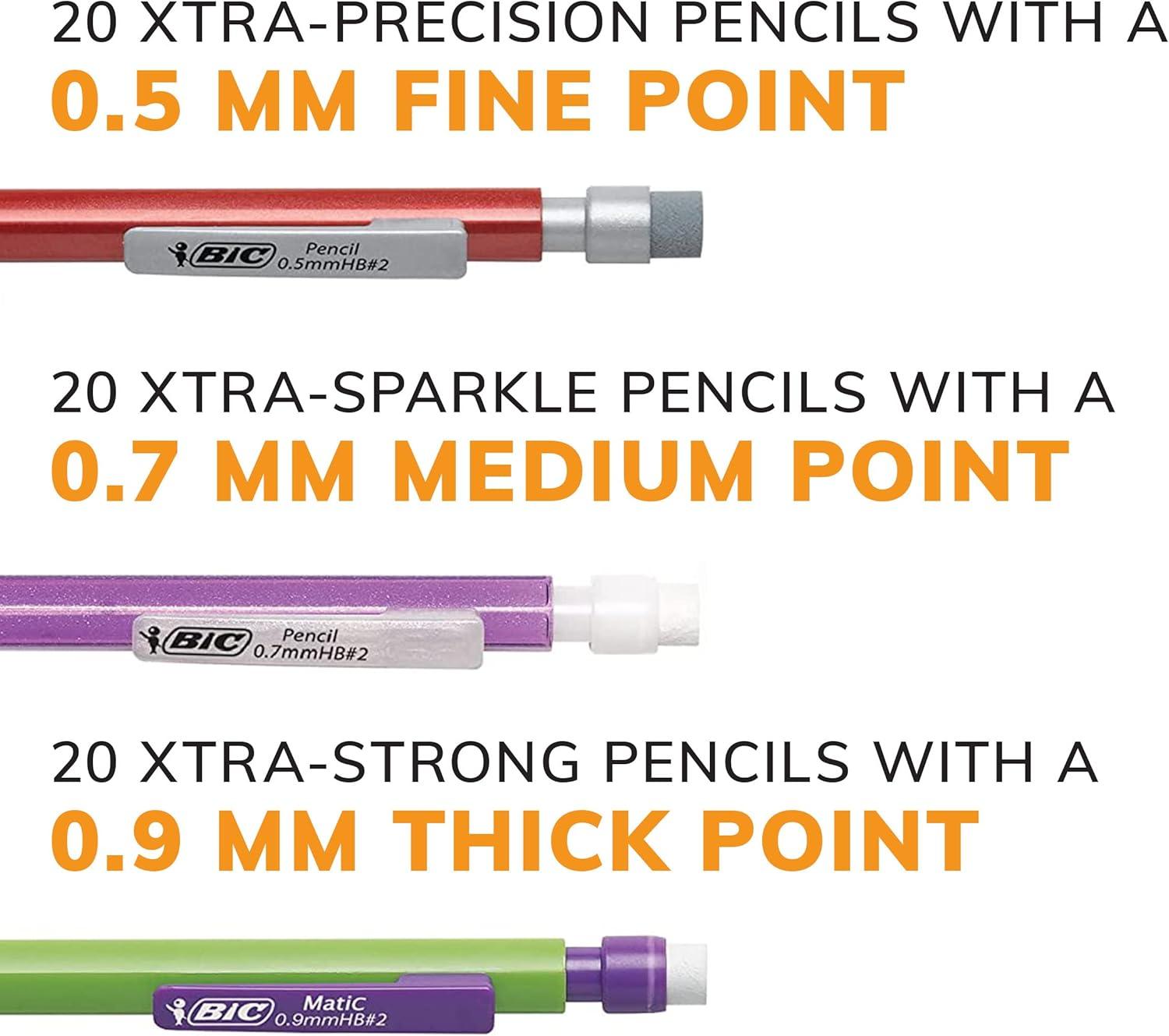 Includes 20 Xtra-Precision pencils with fine 0.5mm points, 20 Xtra-Sparkle pencils with medium 0.7mm points, and 20 Xtra-Strong pencils with thick 0.9mm points