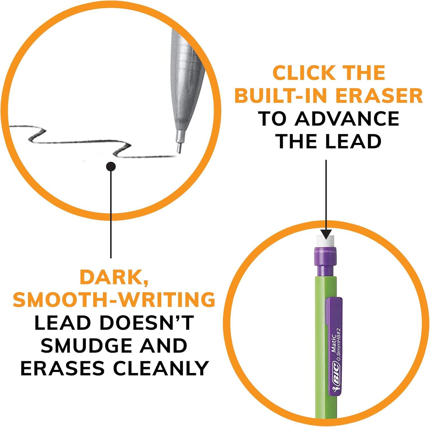 Be prepared for any writing occasion with BIC Number 2 Mechanical Pencils With Erasers. This BIC mechanical pencil variety pack contains 20 Xtra-Precision pencils with fine 0.5mm points, 20 Xtra-Sparkle pencils with medium 0.7mm points, and 20 Xtra-Strong pencils with thick 0.9mm points. They’re the perfect bulk mechanical pencils for school and come with three pieces of No. 2 lead that’s compatible with most standardized tests. The high-quality lead doesn’t smudge and erases cleanly, so your work looks neat and professional. Convenient and reliable, BIC’s refillable mechanical pencils never need sharpening; to advance the lead, simply click the built-in eraser. The BIC Xtra-Precision 0.5mm mechanical pencil creates precise, sharp lines. The Xtra-Sparkle 0.7mm mechanical pencils have sparkly, fun designs, while the Xtra-Strong thick mechanical pencils have 0.9mm break-resistant lead. This 60-count pack of mechanical pencils in bulk is perfect for school or office supplies. The Number 1 selling mechanical pencil in the United States*, BIC offers dependable performance and value. Choose a BIC mechanical pencil set with assorted lead sizes for a high-quality, safe and affordable product you can trust.*Source: The NPD Group/Retail Tracking Service and Commercial Tracking Service, U.S., based on actual unit sales, 12ME June 2022 combined