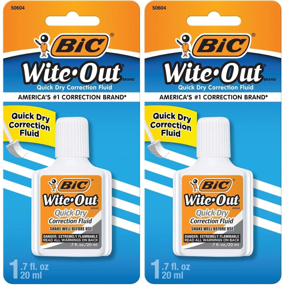 Cover minor errors on school or office documents with BIC Wite-Out Quick Dry Correction Fluid. Made by America's #1 Correction Brand,* this quick-drying white fluid works on handwritten or printed ink, faxes, and photocopies. The Wite-Out Quick Dry correction fluid has a reduced dry time and is easy to apply with the precise foam brush. For best results, shake the correction fluid before using. Similar to whiteout pens and tape, the BIC Wite-Out Quick-Dry Correction Fluid covers photocopies, faxes, ink, permanent marker, and more. *Source: The NPD Group/Retail Tracking Service and Commercial Tracking Service, U.S. based on dollar sales; 12ME June 2022 combined. BIC defines correction as including fluid, tape, and pens